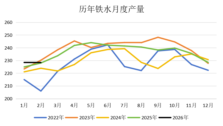 從歷年鐵水的數(shù)據(jù)來看,節(jié)后鋼企產(chǎn)量恢復(fù)速度較快,2026年初的鐵水產(chǎn)量處于歷史同期高位水平,且市場對未來需求持較大疑問,今年節(jié)后產(chǎn)量預(yù)計(jì)會(huì)逐漸恢復(fù),但恢復(fù)速度還有待觀察。
