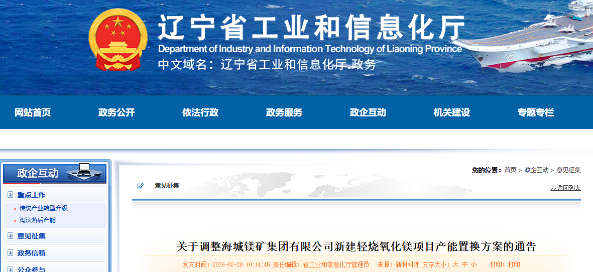 按照《遼寧省人民政府辦公廳關于推進菱鎂行業(yè)高質(zhì)量發(fā)展的實施意見》(遼政辦發(fā)〔2023〕15號)、《遼寧省菱鎂礦浮選及鎂砂行業(yè)產(chǎn)能置換辦法》(遼工信建材〔2024〕18號)要求,以及菱鎂行業(yè)專項整治工作會商會議安排,根據(jù)企業(yè)調(diào)整申請及鞍山市工信局初審,省級復核,我廳于2026年2月9日至2月27日,對海城鎂礦集團有限公司新建輕燒氧化鎂項目產(chǎn)能置換方案進行了公示,公示期間無異議,現(xiàn)予通告。