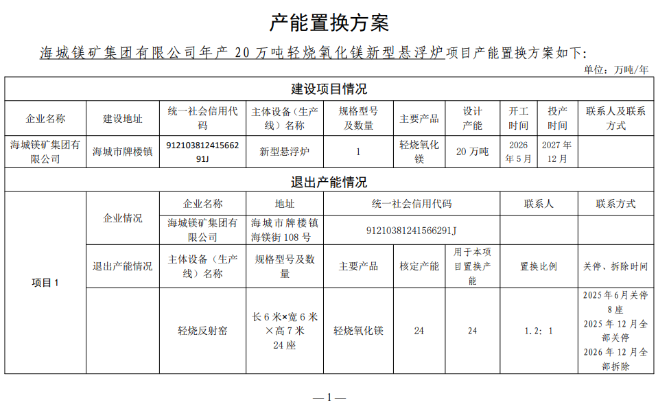 附件:海城鎂礦集團有限公司產(chǎn)能置換方案