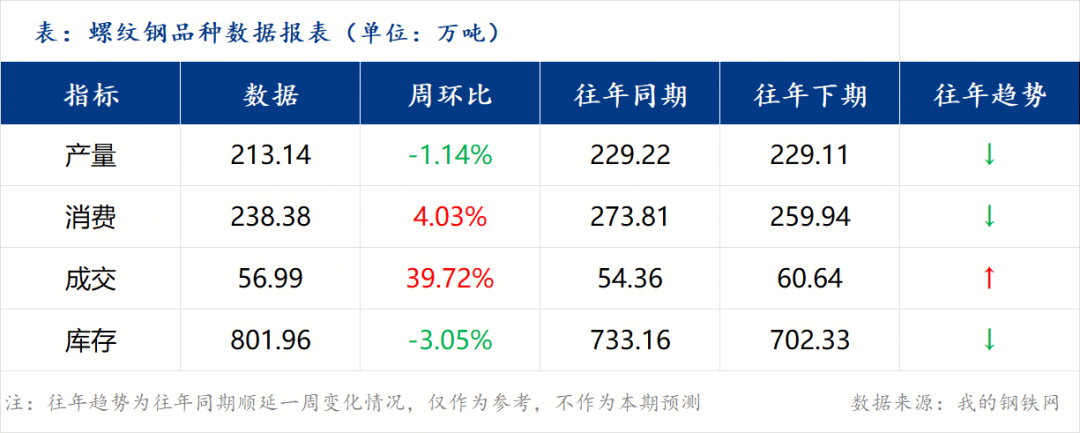 總結(jié):產(chǎn)量:當(dāng)前產(chǎn)量由增轉(zhuǎn)降,復(fù)產(chǎn)節(jié)奏放緩。本周螺紋鋼產(chǎn)量為213.14萬噸,周環(huán)比下降1.14%(減少2.45萬噸)。據(jù)Mysteel調(diào)研,本周137家螺紋鋼廠的開工率為41.64%,產(chǎn)能利用率為46.72%。減產(chǎn)主因部分鋼廠在盈利水平仍偏低的背景下進(jìn)行臨時檢修。預(yù)計下周產(chǎn)量或維持低位震蕩,生產(chǎn)節(jié)奏受利潤制約。需求:表需連續(xù)第八周回升,增幅有所擴大。本周螺紋鋼表觀消費量為238.38萬噸,周環(huán)比上漲4.03%(增加9.24萬噸)。需求已進(jìn)入傳統(tǒng)旺季通道,且本周增幅較前幾周明顯提升,反映季節(jié)性需求正在逐步釋放。但絕對水平與歷史旺季相比仍有差距,房地產(chǎn)新開工疲軟仍是主要制約。預(yù)計下周表需在季節(jié)性支撐下或繼續(xù)溫和增加。成交:市場成交量明顯改善,終端采購積極性上升。本周螺紋鋼成交量為56.99萬噸,周環(huán)比上漲39.72%。期螺趨強運行帶動商家現(xiàn)貨報價主流順勢上調(diào),終端按需采購與部分投機需求均有入場。預(yù)計下周成交在需求釋放與市場情緒回暖的背景下或維持活躍。庫存:總庫存連續(xù)第五周下降,去庫速度加快。本周螺紋鋼總庫存為801.96萬噸,周環(huán)比下降3.05%(減少25.24萬噸)。其中,鋼廠庫存200.62萬噸,環(huán)比減少6.92萬噸,降幅3.33%;社會庫存601.34萬噸,環(huán)比減少18.32萬噸,降幅2.96%。庫存已進(jìn)入加速去化通道,但絕對水平仍處高位,區(qū)域結(jié)構(gòu)仍不平衡(如杭州庫存147.4萬噸)。預(yù)計下周庫存維持去化,速率或受需求強度影響。綜上所述,本周基本面呈現(xiàn) “供減需增、庫存加速去化” 的積極變化格局。供應(yīng)端在利潤壓制下主動收縮,而需求端在季節(jié)性驅(qū)動下復(fù)蘇力度增強,帶動庫存去化速度明顯加快。市場情緒在期現(xiàn)價格聯(lián)袂上漲(螺紋鋼現(xiàn)貨均價周漲31元/噸)中得以提振。盡管高庫存的絕對壓力依然存在,但在成本支撐有效、產(chǎn)業(yè)壓力相對可控的背景下,前期弱勢下跌釋放了部分風(fēng)險并強化了市場抗跌情緒。綜合來看,短期市場在供需邊際改善的驅(qū)動下,情緒及價格重心或呈現(xiàn)小幅趨強的運行態(tài)勢。
